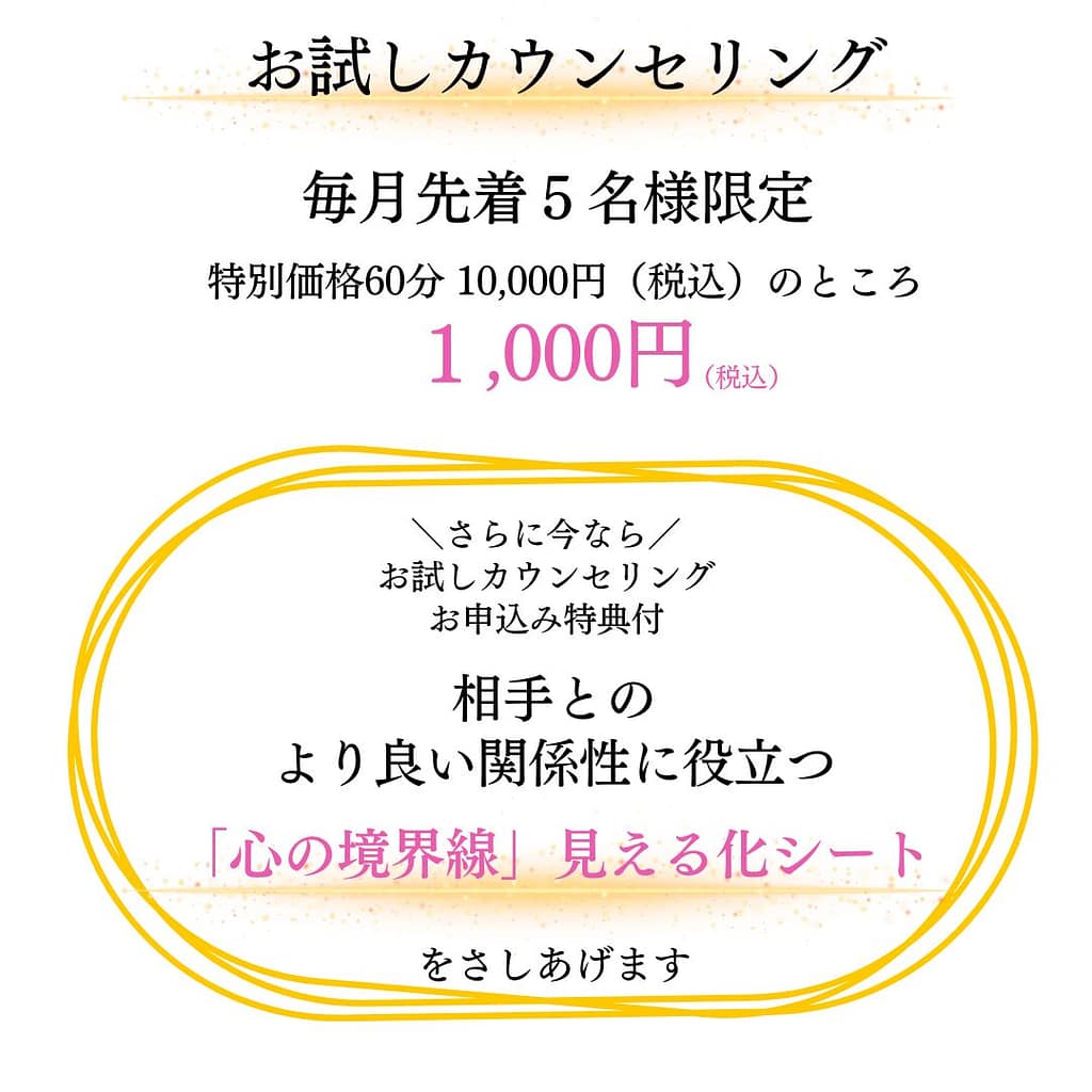 そのような方のために「心の敷地」という療法で心理教育させていただきます。他人に振り回されやすい方、自分軸が見つからずに悩んでいる方、どのように距離感を保って良いのか悩んでいる方にとても好評内容です。今お申し込みの方限定で「心の敷地発見シート」をプレゼントしております。